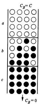 Рисунок 4.2 – Схема ионообменного процесса в ионитном фильтре: · - ионит, насыщенный ионами А; o - ионит, насыщенный ионами В.
