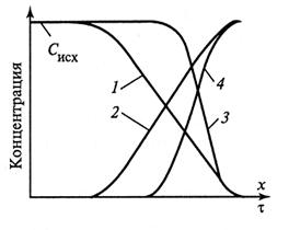 Рисунок 4.3 – Фронты фильтрования и выходные кривые в ионитных фильтрах: 1 – диффузионный фронт фильтрования; 2 – выходная кривая при диффузионном слое; 3 – острый фронт фильтрования; 4 – выходная кривая при остром фронте; х – высота слоя ионита; t - время работы фильтра. От вида кривой фронта фильтрования зависит степень использования обменной емкости при работе фильтра, поэтому при обосновании ионообменной технологии иониты подбирают так, чтобы сорбция наиболее важных ионов в водоподготовке происходила при остром фронте фильтрования. На формирование фронта фильтрования влияют также гидродинамические процессы, определяемые скоростью фильтрования, структурой зернистого слоя, конструкцией дренажных устройств и рядом других факторов.