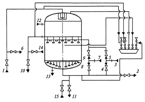 Рисунок 4.5 - Схема противоточного ионитового фильтра типа ФИПр: 1 – подвод исходной воды; 2 – отвод обработанной воды; 3 – 5 – подвод промывочной воды соответственно общий, в нижнее распределительное устройство (РУ) и блокирующее РУ; 6 – отвод промывочной воды; 7 – 9 – подводы регенерационного раствора соответственно общий, в нижнее РУ и в блокирующее РУ; 10, 11 – дренажи; 12 – гидрозагрузка; 13 – гидровыгрузка; 14, 15 – подвод воды для взрыхления в среднее и нижнее РУ.