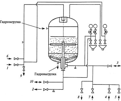 Рисунок 4.6 - Схема двухпоточного-противоточного ионитового фильтра типа ФИПр-2П: 1 – подвод исходной воды; 2 – отвод обработанной воды или отработанного регенерационного раствора и отмывочной воды; 3 – подвод исходной воды или отвод отработанной воды; 4 – подвод регенерационного раствора; 5 – подвод воды для взрыхления; 6 – подвод регенерационного раствора и отмывочной воды; 7 – подвод отмывочной воды; 8 – отвод отработанного регенерационного раствора и отмывочной воды; 9 – дренаж; 10 – подвод взрыхляющей воды, дренаж.