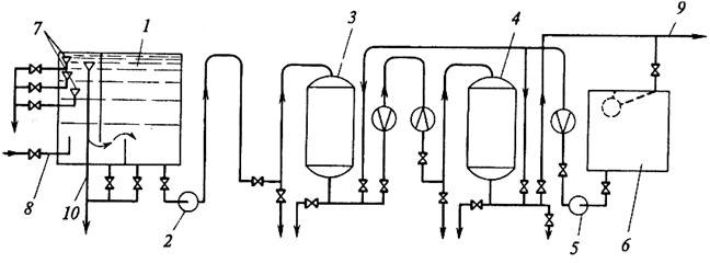 Рисунок 5.1 - Принципиальная схема очистки вод от нефтепродуктов: 1 – приемный бак-отстойник; 2 – насос; 3 – механический фильтр; 4 – сорбционный фильтр с активированным углем; 5 – насос для промывки фильтров; 6 – бак для промывочной воды; 7 – пробоотборные устройства; 8 – подвод воды для очистки; 9 – очищенная вода; 10 – нефтепродукты на сжигание.