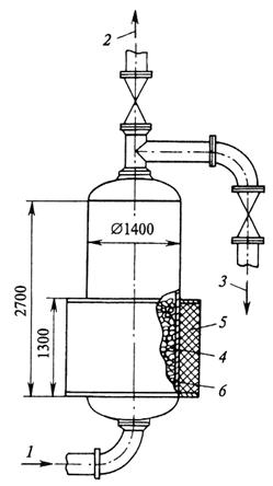 Рисунок 5.2 – Схема электромагнитного фильтра: 1 – вход конденсата; 2 – выход конденсата; 3 – слив конденсата в дренаж при промывки фильтра; 4 – намагничивающиеся шарики из углеродистой стали; 5 – электрическая катушка для создания магнитного поля; 6 – корпус фильтра из немагнитной стали.