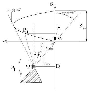 Связь между основными размерами и α (на примере механизма с толкателем)