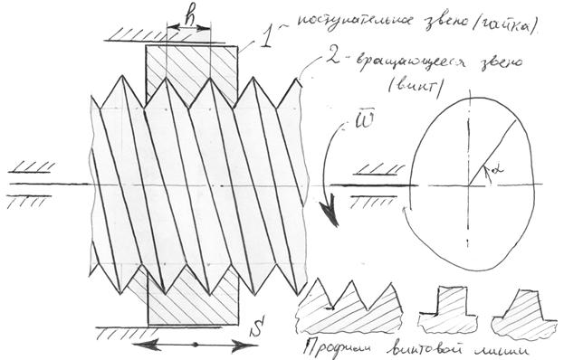 Усилие, передаваемое винтовой передачей, может достигать значительных усилий, но велики потери на трение в паре. Поступательное движение может выполнять как гайка так и винт (см. рис). Пара “гайка-винт” образуют кинематическую пару 4 класса имеющую две степени свободы одна из которых поступательное движение звеньев друг относительно друга. Поэтому для уменьшения трения и “заедания” в месте контакта необходим подбор материалов винта и гайки. Как правило используются пары “сталь-сталь”, “сталь-бронза”, “сталь-латунь” и т.п. Профиль винтовой линии выполняется, как правило, треугольным или прямоугольным, в зависимости от назначения механизма. Для значительного уменьшения трения в винтовой паре используется шарико-винтовой механизм