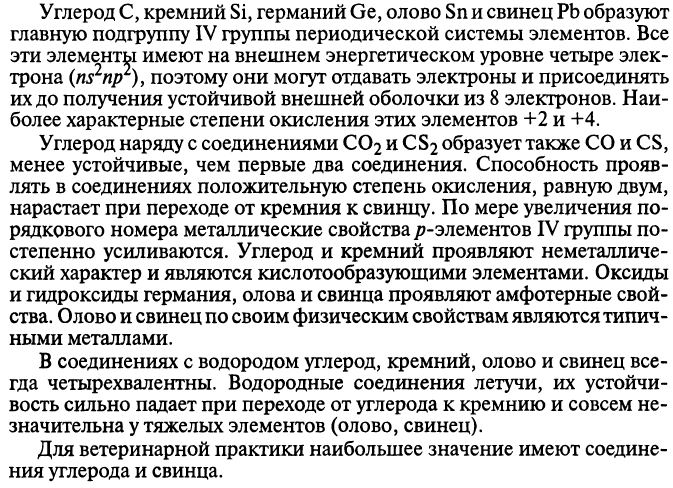 - Круговорот углерода в природе включает биологический цикл, выделение СО2(=> фотосинтез). Соединения кремния относительно нетоксичны. Но очень опасно вдыхание высокодисперсных частиц как силикатов, так и диоксида кремния, попадая в лёгкие, кристаллизующихся в них, а возникающие кристаллики разрушают лёгочную ткань и вызывают тяжёлую болезнь — силикоз. Малые количества германия не оказывают физиологического действия на растения, но токсичны в больших количествах. Германий нетоксичен для плесневых грибков. Олово входит в состав желудочного фермента гастрина. Свинец и его соединения токсичны. Попадая в организм, свинец накапливается в костях, вызывая их разрушение. Широкого применения в медицине свинец не получил из-за своей высокой токсичности. Используется только Pb(CH3COO)2·3H2O, или свинцовая вода, для примочек от ссадин В настоящее время олово в медицине не используется.