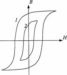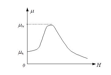 Рассмотрим изменение магнитной индукции первоначально размагниченного ферромагнитного материала при постепенном возрастании напряженности внешнего магнитного поля. График, отражающий эту зависимость, показан на рисунке 38 и называется кривой начального намагничивания. В области слабых магнитных полей наклон этой кривой сравнительно невелик, а затем он начинает возрастать, достигая максимального значения. При еще больших значениях напряженности магнитного поля наклон уменьшается так, что изменение магнитной индукции с ростом поля становится незначительным — происходит магнитное насыщение, которое характеризуется величиной BS. На рисунке 39 показана зависимость магнитной проницаемости от напряженности магнитного поля. Для этой зависимости характерны две величины: начальная μн и максимальная μм магнитная проницаемость. В области сильных магнитных полей проницаемость падает с ростом поля. При дальнейшем увеличении внешнего магнитного поля намагниченность образца практически не изменяется, а магнитная индукция растёт только за счёт внешнего поля.