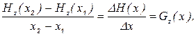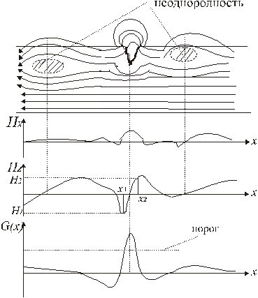 где Hz(x1), Hz(x2) — значения проекции вектора H на ось z в точках x1, x2 (левее и правее дефекта), Gz(x) принятоназывать градиентом напряженности магнитного поля. Зависимость Gz(x) показана на рисунке 44. Расстояние Dx = x2 – x1 между точками, в которых измеряются проекции вектора H на ось z, выбирается с учетом размеров поля рассеяния дефекта. Как следует из рисунка 44, и это хорошо согласуется с практикой, значение градиента над дефектом существенно больше его значения над неоднородностями металла детали. Именно это позволяет достоверно регистрировать дефект по превышению градиентом порогового значения (рисунок 44). Выбирая необходимое значение порога, можно свести ошибки контроля к минимальным значениям.