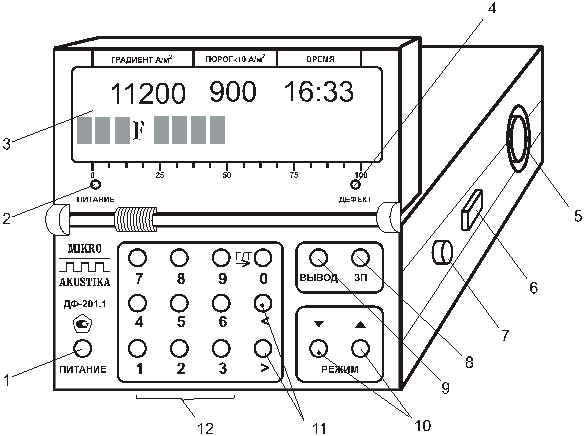 Рисунок 79 Внешний вид дефектоскопа ДФ‑105А 1 — кнопка включения питания; 2 — световой индикатор питания; 3 — световой индикатор дефектов; 4 — световой индикатор разряда аккумуляторов; 13.2.5 Дефектоскоп-градиентометр феррозондовый ДФ‑201.1