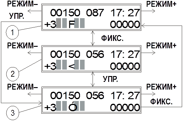 Рисунок 82 Карта переключений состояний: 1 — ФИКС.; 2 — обнаружение дефектов и измерение градиента; 3 — УПР. Состояние ФИКС. индицируется символом F во второй строке дисплея. В этом состоянии значение порога фиксировано и не изменяется во время дефектоскопирования (рисунок 83 в). Состояние обнаружение дефектов и измерение градиента индицируется символом < во второй строке дисплея. В этом состоянии порог изменяется (следит) в соответствии с уровнем фона. Следует заметить, что в состоянии ФИКС. на дисплее высвечивается истинное значение порога, а в состояниях обнаружение дефектов и измерение градиента и УПР. — разница между истинным значением порога и уровнем фона. Состояние УПР. индицируется символом Соотношения между значениями порогов и уровнем фона (в динамике это соответствует перемещению ФП слева направо в направлении оси x) для этих состояний показано на рисунке 83 (а, б). Следует заметить, что значения порога для всех трех состояний установлено с помощью операции настройка порога по сигналу дефекта (см. руководство по эксплуатации прибора Ф‑205.03). Анализ графиков позволяет сделать следующие выводы: — контроль детали с заметным изменением фонового значения градиента в состояниях УПР.и обнаружение дефектов и измерение градиента (рисунок 83 (б, а)) позволяет надежно (без пропусков) обнаружить дефект. Однако дефектоскопист должен помнить, что при замедлении скорости перемещения ФП в области дефекта прибор может «воспринять» изменение значения градиента над дефектом как приращение фона. В этом случае индикаторы дефектов не сработают, и дефект будет пропущен. То есть при контроле скорость перемещения ФП должна быть стабильной и такой же, как при настройке порога; — контроль детали с заметным изменением фонового значения градиента в состоянии ФИКС. (рисунок 83в) может привести как к пропуску дефекта (дефект оказался ниже уровня фона), так и к ложному срабатыванию индикаторов дефектов в точке, где уровень фона оказался выше порога. С другой стороны, при поиске дефекта помимо срабатывания индикаторов дефекта дефектоскопист может контролировать ситуацию (значение фона, наличие дефекта) по показаниям градиентометра. Для опытного дефектоскописта это поможет избежать ошибок и в состоянии ФИКС. (рисунок 83в).