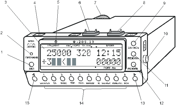Рисунок 80 Внешний вид дефектоскопа-градиентометра ДФ‑201.1 1 — кнопка включения питания; 2 — индикатор включения питания; Таблица 13.4.1