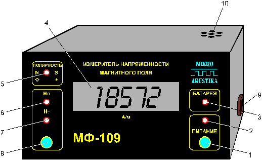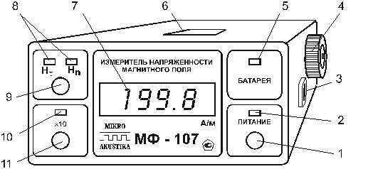 Рисунок 89 Внешний вид измерителя ГФ‑105 1 — звуковой индикатор; 2 — индикатор разряда батареи; 3 — батарея аккумуляторная; 4 — индикатор включения второго диапазона; 5 — кнопка переключения диапазонов измерения; 6 — дисплей; 7 — индикатор включения питания; 8 — кнопка включения питания; 9 — соединитель для подключения ФП; 10 — ФП.
