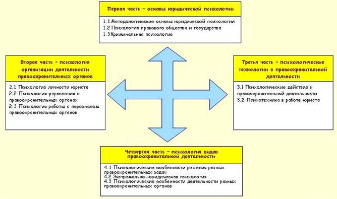 3) криминальная психология - психология преступности. Ее основные направления: • психолого-правовая асоциализация, • психология генезиса противоправного поведения, • психология личности преступника, • психология криминальной среды и преступных групп, • психологические особенности различных видов преступлений, • психологические причины и условия преступного поведения и образа жизни, • криминально-психологический мониторинг и прогнозирование и др. Психологические проблемы криминологии и преступности исследовались активно, но динамика жизни общества не позволяет успокаиваться сделанным, многое из которого быстро устаревает. Вторая часть юридической психологии — психология организации деятельности правоохранительного органа — содержит совокупность знаний по вопросам организации деятельности правоохранительного органа. Ее основные разделы: 1) психология личности юриста с направлениями: • психологические требования к личности юриста, • психологические свойства личности, • психологические особенности профессионального мастерства, • профессионально-психологическая подготовленность юриста, • психология профессиональной культуры юриста, • психограммы юридических специальностей; 2) психология управления в правоохранительных органах, включающая: • психологическую концепцию управления в правоохранительных органах, • личность в системе управления, • психологию личности руководителя правоохранительного органа, • психологию управленческой деятельности руководителя, ее стиля и методов, • психологическую структуру организации управления, • психологию текущего управления, • психологию организации деятельности служб и подразделений правоохранительного органа, • психологические пути совершенствования управления в условиях гуманизации и демократизации жизни общества, • психологию взаимодействия правоохранительных органов, • психологию взаимодействия правоохранительных органов с другими органами, структурами, общественными формированиями и населением, • психологическое обеспечение нововведений в правоохранительных органах; 3) психология работы с персоналом правоохранительных органов, включающая: • профессионально-юридическое ориентирование, • особенности психологического отбора в юридические образовательные учреждения и правоохранительные органы, • психологию юридического образования, • психологию коллектива правоохранительного органа, • психологию правового воспитания сотрудников правоохранительных органов, • морально-психологическую подготовку юриста, • психологию формирования профессионального мастерства юриста, • профессионально-психологическая подготовку юриста, • психологические особенности укрепления организационного порядка и дисциплины в правоохранительных органах, • психологию научной организации труда в правоохранительных органах, • психологию профилактики и преодоления профессиональной деформации личности сотрудника правоохранительных органов, • психологические особенности подготовки и повышения квалификации управленческих кадров; 4) психологическая служба в правоохранительных органах. Раздел приобрел важное значение в современных условиях в связи с созданием психологических служб в МВД, ФСБ, Федеральной пограничной службе и зарождением 