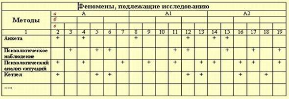 Методика исследования — это способы и приемы конкретизации и реализации методов, их комплексирования, последовательности применения в соответствии со спецификой задач и предмета исследования и требованиями надежности, обоснованности и точности. Методы и методика нуждаются в адаптации к специфике юридико-психологической реальности, особенно методы сбора фактической информации — анкетирование, интервьюирование, психологическое наблюдение, хронометраж, неоконченные предложения, психологический анализ и др. Имеется положительный опыт адаптации методов САН, Кеттелла, Розенцвейга и некоторых других. При отборе методов и их адаптации полезно использование «Матрицы методик» (A.M. Столяренко, 1982), разрабатываемой для каждого исследования с учетом его юридико-психологической специфики (рис. 1.4).