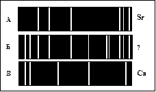22. На рисунках А, Б, В приведены спектры излучения паров стронция, неизвестного образца и кальция. Можно утверждать, что в образце