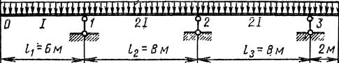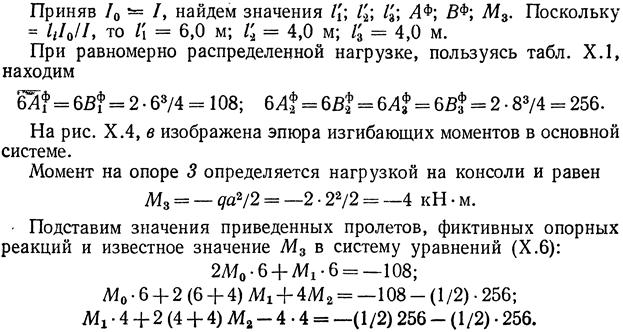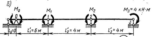 А). Трехпролетную балку с размерами и жесткостями пролетов, указанными на рис. Х.4, а, рассчитать на постоянную равномерно распределенную нагрузку интенсивностью Пользуясь формулой (Х.2) и основной системой (рис. Х.4, б), составим уравнения трех моментов для заданной балки,' их будет три — по числу неизвестных моментов М0, М19 М2; момент на опоре 3 известен: