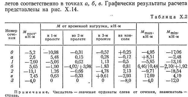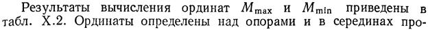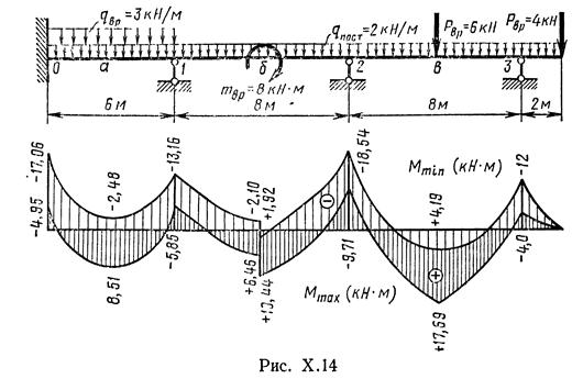 В). Построение обьемлющих эпюр. Для трехпролетной неразрезной балки (см. рис. Х.4, а) рассчитанной в примере Х.1 на постоянную нагрузку и в примере Х.2 на временные нагрузки, построить объемлющие эпюры моментов и поперечных сил.