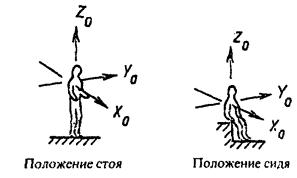 - общую вибрацию подразделяют на действующую вдоль осей ортогональной системы координат X o, Y o, Z o, где X o (от спины к груди) и Y o (от правого плеча к левому) - горизонтальные оси, направленные параллельно опорным поверхностям; Z o - вертикальная ось, перпендикулярная опорным поверхностям тела в местах его контакта с сиденьем, полом и т.п.