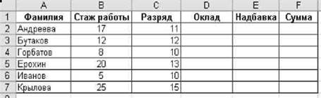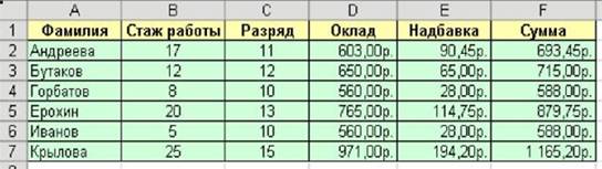 Рис. 6 Таким же образом введите значения окладов для остальных сотрудников. Аналогично введите значения надбавок. Рассчитайте суммы зарплат. Отформатируйте таблицу согласно рисунку