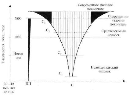 Рис. 4.2. Схема эволюции природных предпосьиок и сознания человека П П — природные предпосылки, С — уровень развития и достижений сознания Французской и отечественной психологическими школами был открыт и исследован механизм интериоризации1 — переноса От лат. interior - внутренний. 4. Проблема личности в психологии внешних предметных действий, выполненных человеком, во внутренний план, превращения их в действия, выполняемые в уме (умственные действия), в интеллектуальные возможности человека, что позволило дать ответ на приведенные выше вопросы. Каждое поколение, каждый человек, появляясь на свет, застает определенный уровень развития человеческого сознания, познания мира, опыта жизни живущих поколений. Родившиеся 1—4 десятка тысяч лет назад заставали весьма бедный опыт (рис. 4.2, позиция С1) преимущественно отдельного племени — примитивные каменные орудия, способы охоты, язык, человеческие отношения, которые тем не менее воплощали в себе опыт и возможности сотен и тысяч предшествующих поколений. Например, в особенностях изготовленного каменного топора воплотились знания изготовителя, его представления о способах и технике использования этого орудия. Выслушивая разъяснения, наставления, наблюдая за действиями взрослого представителя племени, подражая ему, юноша постигал таинство свойств, возможностей и способов использования топора. (Иначе говоря, он интериоризировал, присваивал, делал своим опыт обучавшего его и предшествующих поколений людей. То, на что ранее жившие поколения тратили сотни и тысячи лет, он постигал за несколько дней, месяцев или лет. Далее этот человек и его потомки, «стоя на плечах» ранее живших людей, за время своего существования вносили в общий опыт что-то новое, свое, чуть расширяя опыт (рис. 4.2, позиция С2 ). Находящиеся на более высоком уровне развития опыт и соответствующее ему сознание заставало появившееся на [свет очередное молодое поколение людей. Создавались благоприятные условия, чтобы за относительно короткий отрезок своей жизни сделать достоянием своего сознания более богатый опыт и развиться совершеннее в соответствии с ним. За время жизни, опираясь на достижения предков, они обогащали их и Поднимали планку развития сознания еще выше и т.д., и т.д. В Последние 100—150 лет «воронка» опыта расширяется стремительно, и новые поколения людей попадали в значительно более благоприятные условия для развития своей психики и возможностей. Дело «за малым» — присвоить этот опыт, обеспечить свое богатое и быстрое развитие. Раздел II. Психология и педагогика: личность, группа, общество Эволюция животного мира шла, как доказал ешс Ч. Дарвин, по законам биологической наследственности, т. е. у новых поколений животных определенного вида возникали более совершенные формы поведения (инстинкты — генетически обусловленные, безусловно-рефлекторные, бессознательные поведенческие акты и большие возможности прижизненной выработки условных рефлексов) лишь после того, как опыт борьбы за су-шествование их предков воплощался в анатомо-физиоло-гические изменения нервной системы родителей и передавайся генетически детенышам. Для этого нужны были сотни тысяч и миллионы лет стихийных биологических мутаций. Но у человека возникла принципиально новая форма закрепления и передачи опыта старших поколении — через про