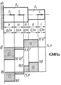 Две первые задачи каждого варианта могут быть решены после усвоения тем 2.1, 2.2, 2.4 и 2.5. Прежде чем приступить к их решению, студент должен научиться владеть методом сечений для определения внутренних силовых факторов. Эти навыки пригодятся студентам для выполнения других задач второго задания. Первая задача (задачи 61-70) требует от студента умения строить эпюры продольных сил, нормальных напряжений, определять удлинения или укорочения бруса. При работе бруса на растяжение и сжатие в его поперечных сечениях возникает продольная сила N. Продольная сила в произвольном поперечном сечении бруса численно равна алгебраической сумме проекций на его продольную ось всех внешних сил, действующих на отсеченную часть. Для расчета на прочность и определения перемещений необходимо знать закон изменения продольных сил по его длине. Правило знаков: при растяжении продольная сила положительна, при сжатии - отрицательна. Условие прочности при растяжении и сжатии имеет вид σ= Последовательность решения задачи: 1. Разбить брус на участки, начиная от свободного конца. Границами участков являются сечения, в которых приложены внешние силы, а для напряжений также и места изменения размеров поперечного сечения. 2. Определить по методу сечений продольную силу для каждого участка (ординаты эпюры N) и построить эпюру продольных сил N. Проведя параллельно оси бруса базовую (нулевую) линию эпюры, отложить перпендикулярно ей в произвольном масштабе получаемые значения ординат. Через концы ординат провести линии. Проставить знаки и заштриховать эпюру линиями, параллельными ординатам. 3. Для построения эпюры нормальных напряжений определяем напряжения в поперечных сечениях каждого из участков. В пределах каждого участка напряжения постоянны, т.е. эпюра на данном участке изображается прямой, параллельной оси бруса. 4. Перемещение свободного конца бруса определяем как сумму удлинений (укорочений) участков бруса, вычисленных по формуле Гука. Пример 8. Для данного ступенчатого бруса (рис 12, а) построить эпюру продольных сил, эпюру нормальных напряжений и определить перемещение свободного конца, если Е= 2*105 МПа = 2*1011 Па; F1= 30 кН = 30*103 Н; F2=28 кН =38*103 Н; F3=42 кН = 42*103 Н; А1=1,9 см2 =19*10-4 м2; А2=3,1 см2 = 3,1*10-4 м2.