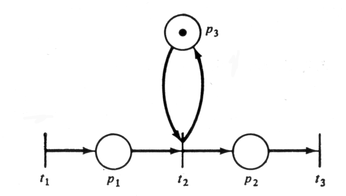 Цель введения этой новой позиции p'i – представить условие «pi пуста». Следовательно, pi и p'i дополнительны; pi имеет фишку, только если p'i не имеет фишки и наоборот. Любой переход, удаляющий фишку из pi, должен помещать фишку в p'i, а всякий переход, удаляющий фишку из pi, должен помещать фишку в p'i. Начальная маркировка также должна быть модифицирована для обеспечения того, чтобы точно одна фишка была либо в pi, либо в p'i. (Мы допускаем, что начальная маркировка безопасна.) Заметим, что такая принудительная безопасность возможна только для позиций, которые в начальной маркировке являются безопасными и входная и выходная кратность которых равна 0 или 1 для всех переходов. Позиция, имеющая для некоторого перехода выходную кратность 2, будет получать при его запуске две фишки и, следовательно, не может быть безопасной. Простая сеть Петри на рис. 7.6 преобразована в безопасную, как показано на рис. 7.7