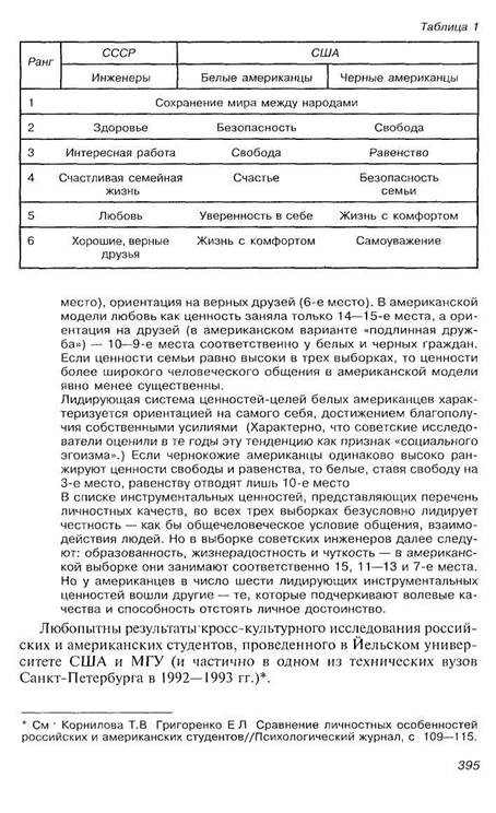 393 многих культур, но нигде им не придается такого значения, как в западных культурах. Различие в иерархии ценностей характерно для культур различных социальных слоев, классов, группы. Так, значимость творческой самореализации для творческой интеллигенции иная, чем для представителей иных социальных слоев. Но различия приоритетов социальных групп, профессиональных, демографических общностей в рамках одного общества все-таки базируются на основе общеразделяемой системы фундаментальных, базисных ценностей. Последние задают приоритеты конечных смыслов бытия, иерархию этических ценностей, характерных для любого представителя данного общества. Поэтому, пожалуй, наиболее ярко проявляются различия приоритетов ценностей различных обществ, народов, цивилизаций. Изучение различия приоритетов этого порядка привлекает особое внимание социологов. Результаты подобных кросс-культурных исследований, подчеркивающие различия культур разных народов, прежде всего их приоритетов ценностей, позволяют более точно определить облик общества, в том числе и своего. Сравнение всегда что-то подчеркивает, заставляет задуматься, В этом помогают и данные исследований. Речь, в частности, идет о проведенных в нашей стране иссследованиях под руководством В.А. Ядова и в США — под руководством М. Рокича. Сопоставим некоторые фрагменты структуры ценностных ориентации по выборке инженеров в СССР и национальной выборке белых и черных американцев разного социального статуса*. В системе ценностей авторы выделили: ценности-цели и ценности-средства (инструментальные). Первые свидетельствуют о том, что желательно для человека, вторые — о том, какими личностными качествами, по его мнению, надо обладать, чтобы добиться своих целей (исследование было проведено до глубокого реформирования нашего общества, т.е. в ситуации стабильного развития социалистического общества и соответствующей системы ценностей). Приведем перечень шести доминирующих ценностей-целей в порядке убывания их значимости (табл. 1). Три выборки объединяет общее беспокойство о сохранении мира между народами — высшая общечеловеческая ценность, не имеющая конкурентов. К числу общих ценностей относится также ориентация на материальное благосостояние («жизнь с комфортом» в американском варианте и «материально обеспеченная жизнь» — в российском), которая занимает 5—6-е места у американцев и 7-е место — у наших инженеров. К числу лидирующих ценностей советских инженеров относились ценности общения и человеческих взаимосвязей — любовь (5-е