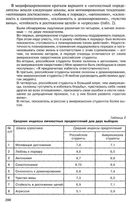 В-шестых, различия показателя «стойкость в достижении целей» на первый взгляд невелики, но дополнительный анализ показал, что у российских студентов этот показатель очень сильно колеблется (хотя средний индекс устанавливается на довольно высоком и близком к американским студентам уровне), а у американских студентов он достаточно высок у всех исследованных. Было выявлено и много общего: и у американских, и у российских студентов выявлены близкие по значению показатели «мотивация достижения» и «склонность к самопознанию», т.е. в обеих культурах немало студентов стремятся к успеху, склонны к рациональному анализу своего поведения. Как нам представляется, полученные данные очень ярко демонстрируют различия между российскими и американскими студентами, порожденные различиями культур, ценностных приоритетов двух обществ. Для российских студентов характерны, с одной стороны, неорганизованность, беспорядочность, непродуманность действий, а с другой стороны, стремление к некой анархичной автономности, стремление избегать ответственности, чувство вины и т.д. Для американских же студентов характерны высокая активность, склонность к доминированию, уверенность в себе, развитая ориентация на порядок, организованность, что «вписывает» его наступательное поведение, активность в рамки общественно дозволенного, приемлемого, делает его активность предсказуемой и управляемой, развивает его индивидуальность, неповторимость в рамках общественного. Не является ли более выраженная у американских студентов склонность к порядку проявлением высокого уровня институализации, организованности американского общества? Слабо выраженное у российских студентов стремление планировать свои действия, их склонность действовать на «авось» — это простая случайность или свидетельство неупорядоченности жизни всего общества, слабой институализированности социальных взаимодействий? конфликты Различие систем ценностей различных субъектов, ценностей если эти субъекты взаимодействуют (или долж- и ПУТИ их НЬ] взаимодействовать) друг с другом, может породить конфликт между ними. Конфликт ценностей — наиболее яркий и острый из всех типов социальных конфликтов. Различие ценностей, их трактовки, иерархии делает невозможным нормальное взаимодействие партнеров, так как партнеры не имеют единых критериев оценки эффективности взаимодействия. Сотрудничество становится невозможным, и взаимодействие перерастает в конфликт. Отец требует, чтобы сын подчинялся его решениям, так как, по его мнению, уважение к родителям является приоритетом во взаимодействии детей и родителей. Сын же считает главным приоритетом свою свободу, самостоятельность. 397 Муж, являющийся представителем культуры, в которой безусловный приоритет отдан отцу как главе семьи, уверен, что его распоряжения не должны оспариваться, как не должно оспариваться и его единоличное право решать главные вопросы. Жена — представительница иной культуры, в которой за ней признаются равные права. Конфликта между ними трудно избежать. Основу Октябрьской революции составляло коренное различие в понимании справедливости рабочим классом и буржуазией, что и привело к непримиримому конфликту. Конфликты ценностей проявляются и в других формах. Так, сегодня существует серьезный конфликт между це
