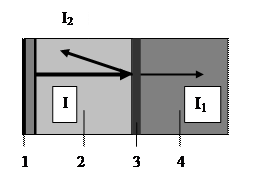 Рис.7. На границе промежуточная среда – биологическая ткань УЗ волна (I) частично отражается (I2) и частично проходит в биологическую ткань (I1).