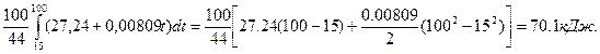 Пример 3. Определить теплоту, поглощённую при нагревании 100 г двуокиси углерода от 15 до 1000ºС при постоянном объёме, если с Решение. Объёмная теплоёмкость равна количеству теплоты, которое необходимо для нагревания на 1ºС 1м3 газа, приведённого к нормальным условиям. При повышении температуры от Т1 до Т2 количество поглощаемой теплоты можно рассчитать по формуле: Q = После интегрирования выражение примет вид: Q=[a0 (T2 – T1) + a1 При вычислении по данной формуле температуру можно брать в градусах Цельсия. Число молей углекислого газа определяем по формуле ν = и тогда количество поглощённой теплоты в рассматриваемом процессе будет равно Q =