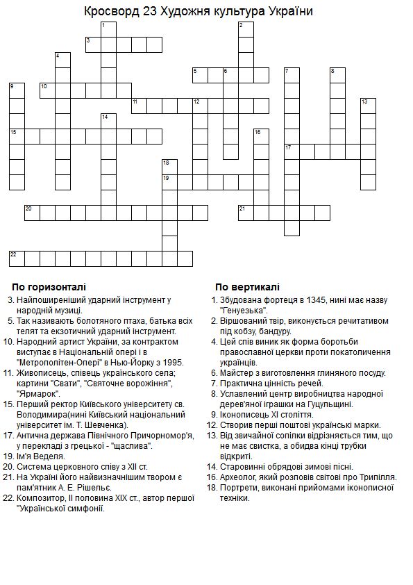 3. Найпоширеніший ударний інструмент у народній музиці.. [БУБОН] 5. Так називають болотяного птаха, батька всіх телят та екзотичний ударний інструмент. [БУГАЙ] 10. Народний артист України, за контрактом виступає в Національній опері і в "Метрополітен-Опері" в Нью-Йорку з 1995.[ ГРИШКО ] 11. Живописець, співець українського села; картини "Свати", "Святочне ворожіння", "Ярмарок". [ПИМОНЕНКO ] 15. Перший ректор Київського університету св. Володимира (нині Київський національний університет ім Т. Шевченка). [МАКСИМОВИЧ] 17. Антична держава Північного Причорномор'я, у перекладі з грецької - "щаслива". [ОЛЬВІЯ] 19. Ім'я Веделя.[ АРТЕМІЙ] 20. Система церковного співу з ХІІ ст. [ВОСЬМИГЛАСІЄ] 21. На Україні його найвизначнішим твором є пам'ятник А. Е. Рішельє. [МАРТОС] 22. Композитор, ІІ половина ХІХ ст., автор першої "Української симфонії” [КОЛАЧЕВСЬКИЙ].