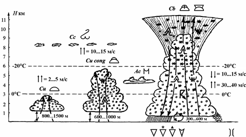 Внутримассовые обл ака об разуют ся над конт инентом летом, во вторую половину дня за счет неравномерного нагревания подст илающ ей поверхност и. Нижняя граница об лачности (НГО) 500…100 0 м, верхняя граница облачности (ВГО) 7...9 км. По площади эти облака располагаются отдельными очагами на б ольшом расстоянии друг от друга, поэтому в полете их можно обойти стороной.
