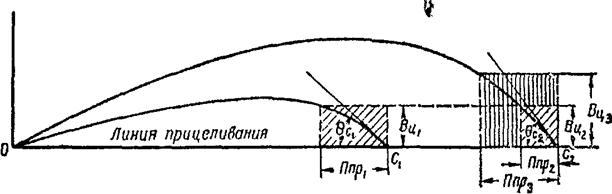 При ведении стрельбы необходимо знать, что расстояние на местности, на протяжении которого нисходящая ветвь траектории не превышает высоты цели, называется поражаемым пространством (глубиной поражаемого пространства Ппр.). Глубина (Ппр.) зависит (рис.9): · от высоты цели (она будет тем больше, чем выше цель); · от настильности траектории (она будет тем больше, чем настильнее траектория); · от угла наклона местности (на переднем скате она уменьшается, на обратном скате – увеличивается). Глубину поражаемого пространства (Ппр.) можно определить по таблицам превышения траекторий над линией прицеливания путем сравнения превышения нисходящей ветви траектории на соответствующую дальность стрельбы с высотой цели, а в том случае, если высота цели меньше 1/3 высоты траектории, - по формуле тысячной: