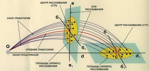 Рис. 13 Сноп траектории, площадь рассеивания, оси рассеивания: а – на вертикальной плоскости, б – на горизонтальной плоскости, средняя траектория обозначена красной линией, С – средняя точка попадания, ВВ1 – ось рассеивания по высоте, ББ1, – ось рассеивания по боковому направлению, dd1, – ось рассеивания по дальности попадания. Площадь, на которой располагаются точки встречи (пробоины) пуль, полученные при пересечении снопа траекторий с какой-либо плоскостью, называется площадью рассеивания.