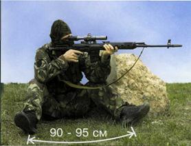 При стрельбе сидя снайпер располагается в вполоборота по отношению к цели. Сидеть он может: · скрестив ноги и поджав их под себя, ступня левой ноги поджимается под голень правой; · расставив ноги, прочно упираясь каблуками в грунт. Локти упираются в зависимости от телосложения во внутреннюю часть коленных чашечек или «сваливаются» (снайпер опирается на колени предплечьями). Полужесткий упор используется для повышения меткости стрельбы, его высота должна быть такой, чтобы не нарушалось правильное положение снайпера, принимаемое без упора. Винтовка укладывается на упор накладками (цевьем) ближе к магазину. Удержание может производиться за магазин (СВД, ВСС) или за приклад снизу (СВ, МЦ, СВД).