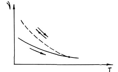 Реальные железоуглеродистые сплавы многокомпонентны. Поэтому их микронеоднородность носит еще более сложный характер. 1.1.6. ВЗАИМОСВЯЗЬ ЖИДКОГО И ТВЕРДОГО СОСТОЯНИЙ СПЛАВА Свойства литого сплава в твердом состоянии определяются •свойствами жидкого сплава и условиями его охлаждения в форме. Связь с жидким состоянием сложна и многопланова. Поэтому в данном курсе мы не будем рассматривать ее всесторонне, передав эту задачу технологическим курсам. Рассмотрим основные принципы, определяющие эту связь. Прежде всего, механические и другие свойства сплава в твердом состоянии в значительной мере определяются его кристаллической структурой. Процесс кристаллизации предполагает возникновение в жидком расплаве зародышей новой кристаллической фазы и ее рост. Зародышеобразование непосредственно связано с наличием в жидкости кластеров и их характеристиками. Кроме того, большое значение имеет наличие в расплаве микроскопических включений различного химического состава и строения. Определить их наличие невозможно никаким химическим анализом. Поэтому очень часто при смене поставщика шихтовых материалов при том же химсоставе выплавляемых сплавов существенно изменяются их свойства. Зависимость свойств сплава от природы шихтовых материалов получила название «наследственность». Кроме неконтролируемого изменения содержания микропримесей наследственность можно объяснить неравновесностью жидкого состояния. Переход системы, является самопроизвольно в течение времени релаксации. При плавлении металла расплав может находиться в неравновесном состоянии, т. е. состав и конфигурация образовавшихся кластеров не обладают минимумом энергии при данных условиях. Если выдержать сплав при данной температуре достаточно долго, то в нем в конце концов установится равновесное состояние. О том, что время релаксации может быть достаточно большим, говорит хотя бы такой факт, что при вводе в расплав металлического феррохрома он не распределяется равномерно в нем даже через 20 мин. Одним из доказательств неравновесности жидкого расплава является гистерезис свойств при нагреве и последующем охлаждении. Суть гистерезиса состоит в том, что значения свойств, полученные в измерениях в ходе нагрева сплава, не совпадают с соответствующими значениями, полученными при последующем его охлаждении. Повторные циклы измерений дают результаты, совпадающие с теми, которые получены при охлаждении сплава в первом цикле. На рис. 1.15 показан характер гистерезиса кинематической вязкости сплава. Явление гистерезиса не обнаруживается, если сплав перед измерениями подвергнуть достаточной по длительности выдержке. Гистерезис свойств можно объяснить также какими-нибудь превращениями в сплаве при нагреве, связанными с выделением из него включений или продуктов взаимодействия компонентов газовой среды или футеровки. Дискуссии по вопросу, что здесь является главным, продолжаются. Однако можно несомненно признать, что неравновесность состояния сплавов имеет место и ее надо учитывать при организации технологического процесса.