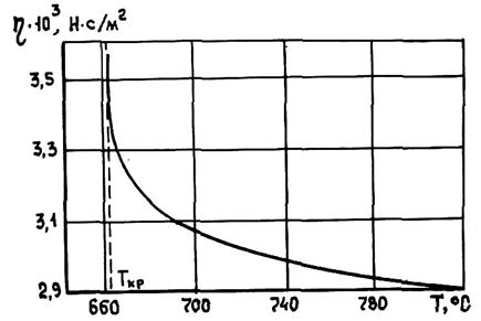 Рис. 1.26. Зависимость динамического коэффициента вязкости h| жидкого алюминия от температуры