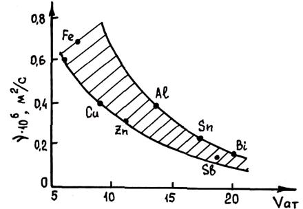 Исследованиями обнаружена четкая корреляция вязкости с объемом, приходящимся на один атом жидкого металла Vат. Кинематическая вязкость n большинства металлов при температурах, близких к температуре затвердевания, удовлетворительно описывается функцией n = К/Vат, где К —коэффициент, приблизительно равный 4—5. Соотношение между n и Vат показано на рис. 1.27 для целого ряда жидких металлов. Связь вязкости с величиной свободного объема металла, не занятого атомами, выражает эмпирическая формула А. И. Бачинского n = =с/(Vат - w), где с и w — эмпирические коэффициенты, не зависящие от давления и температуры. Величина w имеет смысл собственного объема атомов, так что разность (Vат - w) характеризует величину свободного объема.