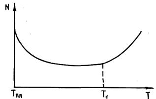 Рис. 2.9. Зависимость числа кристаллических зерен на единице площади шлифа от перегрева металла примесей широко применяется на практике и называется модифицированием первого рода. Например, при введении в жидкий алюминий титана или циркония образуются тугоплавкие интерметаллические соединения TiAl3 и ZrА13, имеющие изоморфную с алюминием кристаллическую решетку. Достаточно ввести в сплав десятые доли процента титана или циркония, как размер кристаллического зерна уменьшается в десятки и сотни раз. Затравочное действие твердых включений зависит от термовременной обработки расплава. На рис. 2.9 приведена зависимость числа кристаллических зерен N на единицу площади шлифа от температуры обработки жидкого сплава. Видно, что с ростом температуры перегрева сплава N уменьшается. Начиная с некоторой, хотя и очень высокой, температуры, ниспадающая кривая переходит в восходящую. Увеличение СВЦК при высоких перегревах объясняется тем, что при этом дезактивированы все включения и сплав кристаллизуется по гомогенному механизму в условиях очень больших переохлаждении. Очевидно, что если в расплаве содержится большое число истинно изоморфных примесей, то их дезактивация при перегреве не происходит. При увеличении перегрева сплава кроме отмеченных выше явлений может происходить растворение включений в расплаве или, наоборот, выделение их из расплава. В зависимости от характера выделяющихся или растворяющихся включений изменяется кристаллическая структура сплава. Например, при перегреве магниевых сплавов, легированных алюминием, марганцем и железом, при некоторой температуре происходит растворение алюминиево-железистых соединений в расплаве. При охлаждении сплава в процессе кристаллизации эти соединения выделяются из расплава в виде компактных изоморфных частиц, что увеличивает СВЦК и измельчает структуру. Этот прием широко применяется в практике магниевого литья и носит название модифицирования перегревом. При перегреве чугуна происходит полное растворение углерода, что по аналогичным перегреву магниевых сплавов причинам приводит к резкому увеличению дисперсности выделяющихся при кристаллизации чугуна включений графита. В заключение отметим, что при кристаллизации на примесях сохраняется характер изменения СВЦК с уменьшением переохлаждения. Однако при этом резко сокращается интервал метастабильности и повышается количественный уровень СВЦК. Это объясняется не только непосредственным влиянием переохлаждения на работу образования и размер критического зародыша, но и увеличением числа неизоморфных включений, удовлетворяющих сформулированному выше условию ориентированного роста. Действительно, по данным Д. Тернбала и Б. Воннегута, энергия упругого деформирования кристалла на подкладке может быть оценена по формуле Δ G = (авкл + aм)2/a2м, а движущая процесс разность энергий Гиббса при увеличении переохлаждения возрастает. Поэтому при увеличении переохлаждения все большее число включений удовлетворяет условию ориентированного зарождения. ГЛАВА 2.3. МЕХАНИЗМ И КИНЕТИКА РОСТА КРИСТАЛЛИЧЕСКИХ ЗАРОДЫШЕЙ Образовавшиеся центры кристаллизации самопроизвольно увеличивают свои размеры. Кристалл растет путем присоединения к нему атомов из окружающего расплава. Способ присоединения атомов к поверхности растущего за