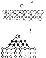 Рис. 2.10. Типы морфологии поверхности растущего Рис. 2.11. Рост кристалла путем присоединения кристалла: а — атомно-гладкая поверхность; отдельных атомов (а) и двумерных зародышей (б) б — ограненная поверхность затем вдоль этих граней. Рост путем присоединения отдельных атомов в данном случае энергетически неустойчив, так как каждый адсорбированный поверхностью атом имеет только одного ближайшего «соседа» и, следовательно, только одну связь (рис. 2.11, а). В таких условиях он не может устойчиво закрепиться на поверхности. Поэтому рост может происходить только путем образования и закрепления тонких, одно-, двух- и трехатомных по толщине, плоских образований атомов, называемых двумерными зародышами. На рис. 2.12 приведена схема двумерного зародыша на грани растущего кристалла. При образовании такого зародыша поверхность кристалла увеличивается на Δ S = 4×2x×d = 8x×d, т. е. на величину поверхности четырех боковых граней. Соответствующее возрастание поверхностной энергии равно As = 8xds = 8×xs', где s' = `ds — поверхностная энергия, приходящаяся на единицу периметра зародыша толщиной d. Если энергию Гиббса зародыша с основанием 1 см2 обозначить j2, а энергию Гиббса, приходящуюся на то же число атомов жидкости, — j1, то для полного изменения энергии при зародышеобразовании можно написать следующее выражение: