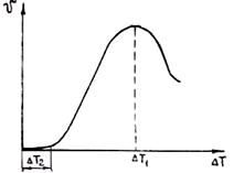Характер зависимости линейной скорости роста от переохлаждения Δ Т показан на рис. 2.13. Величина интервала метастабильности при росте кристаллов Δ Т2 значительно меньше, чем Δ Т1 при зарождении. При этом, как правило, реализуется только восходящая ветвь кривой (см. рис. 2.13). Зависимость можно аппроксимировать следующей функцией:
