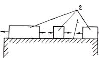 Рис. 2.13. Зависимость линейной скорости Рис. 2.14. Схема одновременного роста нескольких роста кристалла от переохлаждения двумерных зародышей: /—грань кристалла; 2— зародыши Вероятность присоединения к зародышу в единицу времени хотя бы одного атома равна р2 = с2×ехр(—U/kT). Вероятность образования центра кристаллизации вычисляется по формуле