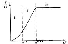 Рис. 2.15. Зависимость механизма роста кристаллов от Рис. 2.16. Кинетическая кривая криcталлизации величины переохлаждения на фронте кристаллизации: I — зона образования двумерных зародышей; II — промежуточная зона; III — зона нормального роста кристаллов