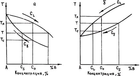 Рис. 2.18. Диаграммы состояния сплавов с понижением (а) и повышением (б) температуры ликвидуса в зависимости от роста концентрации легирующего компонента