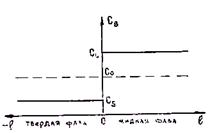 соответствует концентрации, является подвижной и совпадает с положением фронта кристаллизации. В этом случае k0 = СS/СL. 2. Ситуация, более приближенная к реальной, имеет место, когда в твердой фазе при данной скорости роста кристалла не происходит диффузионного перераспределения вещества (Дтв = 0). Однако в жидкости, вследствие интенсивного перемешивания расплава, концентрации выравниваются. Так как Дтв = 0, то состав твердой фазы, образовавшийся на предыдущих стадиях, остается неизменным. Так как при k0 < 1 по мере кристаллизации CS увеличивается (см. рис. 2.18, а), то концентрация вещества будет возрастать по длине твердой фазы, оставаясь на фронте кристаллизации равной соответствующему значению, определенному по диаграмме состояния. Распределение концентраций по длине фаз в рассматриваемом случае приведено на рис. 2.20. Так как концентрация жидкости cl больше концентрации твердой фазы на фронте кристаллизации CS, то при затвердевании жидкости на фронте кристаллизации выделяется легирующий компонент. Например, если за время dt затвердевает dm жидкости, то количество выделившегося вещества равно (Cl—CS)dm. В данном случае это вещество равномерно распределяется по объему жидкости. Явление, связанное с неравномерным распределением концентрации вещества, называется ликвацией. В рассматриваемом случае наблюдается максимальная ликвация в твердой фазе, называемая внутрикристаллической ликвацией. При этом внутренние слои сферического