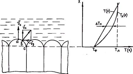 С учетом этого условия формула для определения устойчивости плоского фронта кристаллизации принимает вид GR ³ Из этих выражений видно, что любые мероприятия, направленные на увеличение коэффициента диффузии Д (перемешивание жидкости, применение ультразвука и т. п.), а также снижающие линейную скорость роста, увеличивают устойчивость плоского фронта кристаллизации. ГЛАВА 2.7. ЯЧЕИСТАЯ И ДЕНДРИТНАЯ КРИСТАЛЛИЗАЦИЯ На рис. 2.27 изображен фронт кристаллизации с выступами, находящимися в зоне концентрационного переохлаждения. При росте кристалла скорость перемещения фронта кристаллизации направлена по нормали к его поверхности. Скорость точки a vx будет больше, чем вертикальная компонента скорости точки b, так как точка а находится в зоне большего концентрационного переохлаждения. Поэтому в процессе роста выступ будет заостряться и увеличиваться. В точке а примесь выталкивается при кристаллизации в расплав в направлении кристаллизации. В точке b в соответствии с вектором скорости vy часть примеси будет