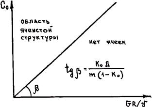 Рис. 2.28. Области ячеистой и сплошной кристаллизации Следует отметить, что нарушение плоского фронта кристаллизации и возникновение ячеек и дендритов может иметь место не только в сплавах, но и при кристаллизации чистого металла за счет обычного термического переохлаждения Δ Tт перед фронтом кристаллизации (рис. 2.31). Дендриты могут образовываться не только при последовательном продвижении фронта кристаллизации, но и при свободном росте кристалла в жидкости при объемном затвердевании. Например, если зародыш имеет форму куба, то, естественно, с его углов теплота кристаллизации будет отводиться в жидкость быстрее, чем с центров граней. Поэтому после достижения критических размеров правильный рост куба прекратится и начнется преимущественное развитие его вершин. На вершинах появятся первичные стволы, а затем на них при выполнении условий, указанных на рис. 2.31,— ответвления, т. е. вторичные ветви. Таким образом, дендрит растет из одного центра. Схема механизма дендритного роста показана на рис. 2.32. Дисперсность дендритов обычно оценивают средним расстоянием между его вторичными осями dм (см. рис. 2.32). Зависимость dм от условий кристаллизации выражается формулой dм = AGRm×vn, где A, т и п — эмпирические величины. Растущие дендриты смыкаются при объемной кристаллизации друг с другом, образуя зерна, которые мы видим на макроструктурах (рис. 2.33). Для выявления субструктуры зерна, т. е. его дендритного строения, необходимо сделать микрошлиф и рассмотреть его под микроскопом. Междендритное пространство обогащено примесями, в которых скапливаются неметаллические включения и образуются усадочные и газовые поры.