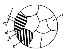 Рис. 2.32. Схема механизма дендритного роста Рис. 2.33. Макроструктура литого сплава при при объемной кристаллизации дендритной кристаллизации: 1— дендритная субструктура; 2 — макрозерно