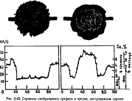 При объемной концентрации ограненной фазы более 40 % при повышенных скоростях роста, а при концентрации 50 % и более в широком интервале условий затвердевания образуется квазирегулярная структура. Она состоит из набора пластин или стержней неограненной фазы с меньшей объемной долей в матрице из ограненной фазы. Примером такого сплава является белый чугун (система Fe — Fе3С). При затвердевании происходит рост пластин цементита в направлении теплоотвода. Одновременно появляются короткие стержни аустенита, расположенные перпендикулярно пластинам цементита. Эта структура представляет собой естественный композит. Пример структуры белого чугуна приведен на рис. 2.42. При определенных условиях ограненная фаза может принимать глобулярную форму, имеющую сложное внутреннее строение. Глобулярный графит имеет сложное строение, включающее в себя комплекс растущих из одного центра чешуек (рис. 2.43). ГЛАВА 2.9. КРИСТАЛЛИЧЕСКАЯ СТРУКТУРА ОТЛИВОК Температурное поле кристаллизующейся отливки неоднородно и нестационарно. Поэтому в разных объемах залитого в форму расплава реализуются различные условия кристаллизации, обусловливающие появление широкого спектра структур.