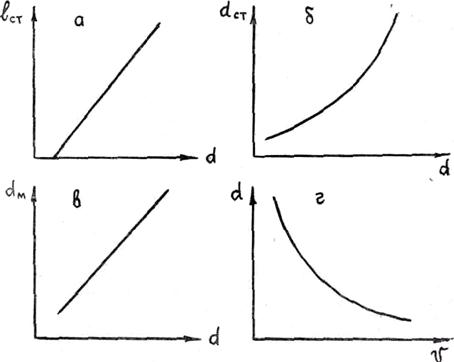 Рис. 2.45. Зависимость между средним размером зерна и протяженностью зоны столбчатых кристаллов (а), их поперечным размером (б), средним расстоянием между вторичными осями дендритов (в) и скоростью кристаллизации (г) Во втором случае (при k1 = 0 и k3 = 1) отливка имеет зернистое строение, состоит из равноосных кристаллов примерно одинаковых размеров. Если уменьшить размер зерна d, a k4 приблизить к нулю (мелкодисперсная субструктура), то механические свойства резко усиливаются.