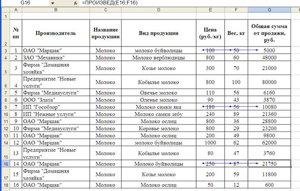 Чтобы вычислить общую сумму от продажи для каждого производителя, поступим следующим образом: Столбцу G присвоим имя Общая сумма от продажи в рублях и впишем эти слова в ячейку G2. Вычисляем общую сумму от продажи для первого производителя по формуле =F3*E3 в ячейке G3. Тиражируем эту формулу до ячейки G18. Результаты вычисления представлены на рис.2 и рис.3.